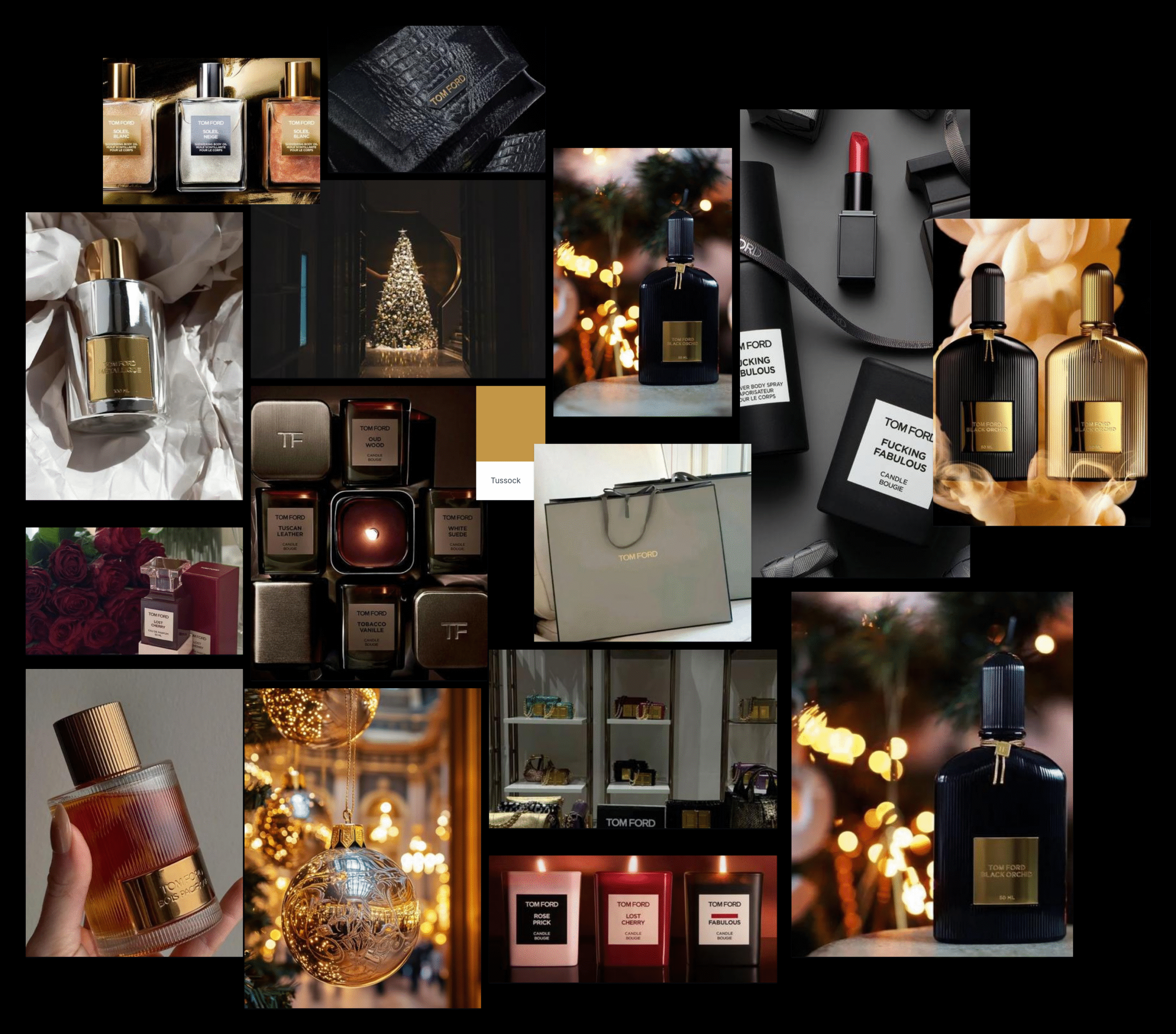 Images of Tom Ford’s iconic products—leather, fragrance, and accessories, paired