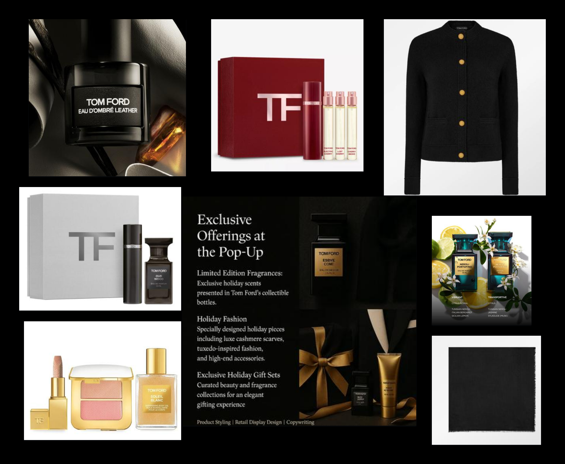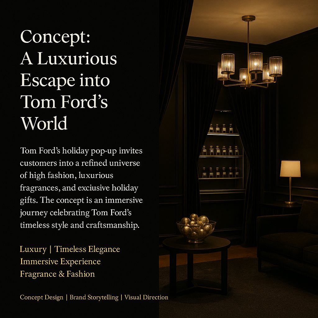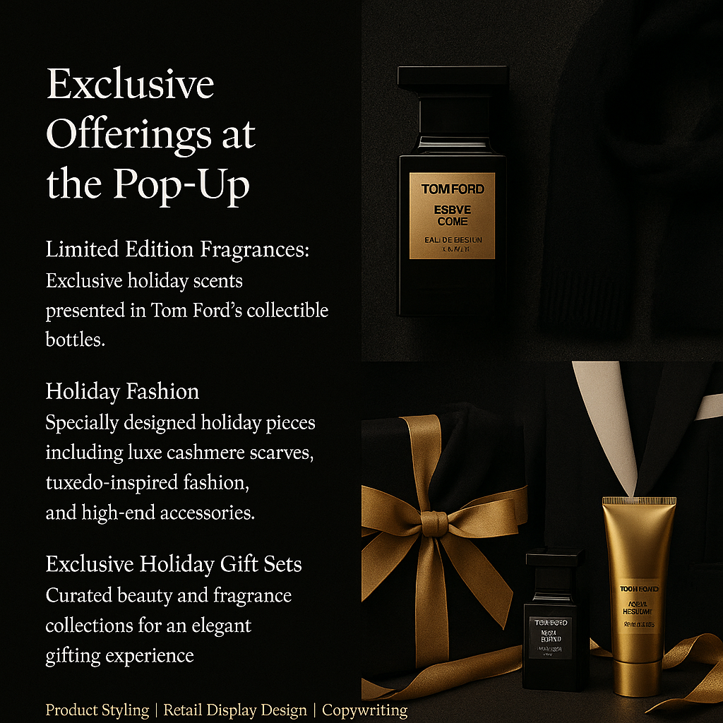 "Tom Ford’s holiday pop-up invites customers into a refined universe of high fashion,luxurious fragrances, and exclusive holiday gifts. The concept is an immersive journey celebrating Tom Ford’s timeless style and craftsmanship.